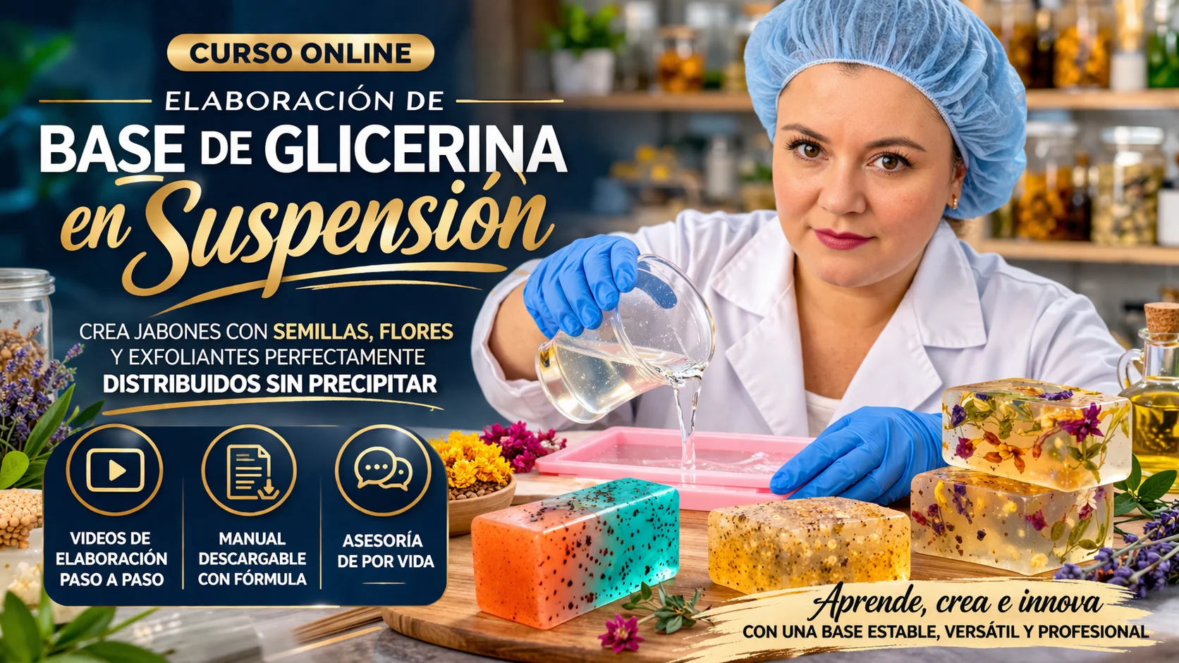 Aprende a elaborar base de glicerina en suspensión y crea jabones con semillas, flores y exfoliantes perfectamente distribuidos. Este curso incluye videos paso a paso, manual descargable con fórmula y asesoría de por vida.